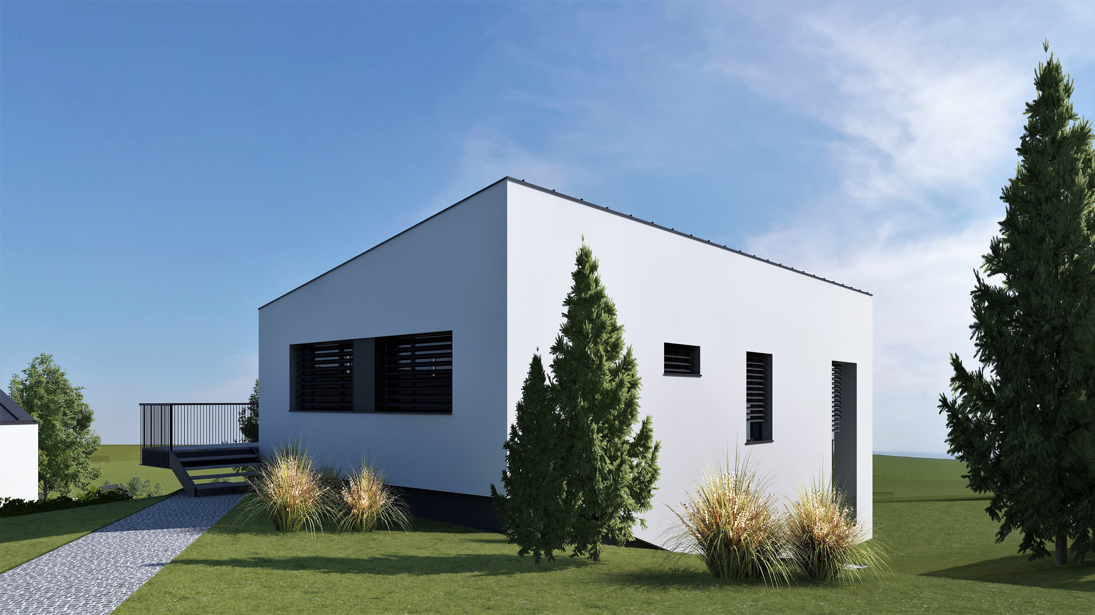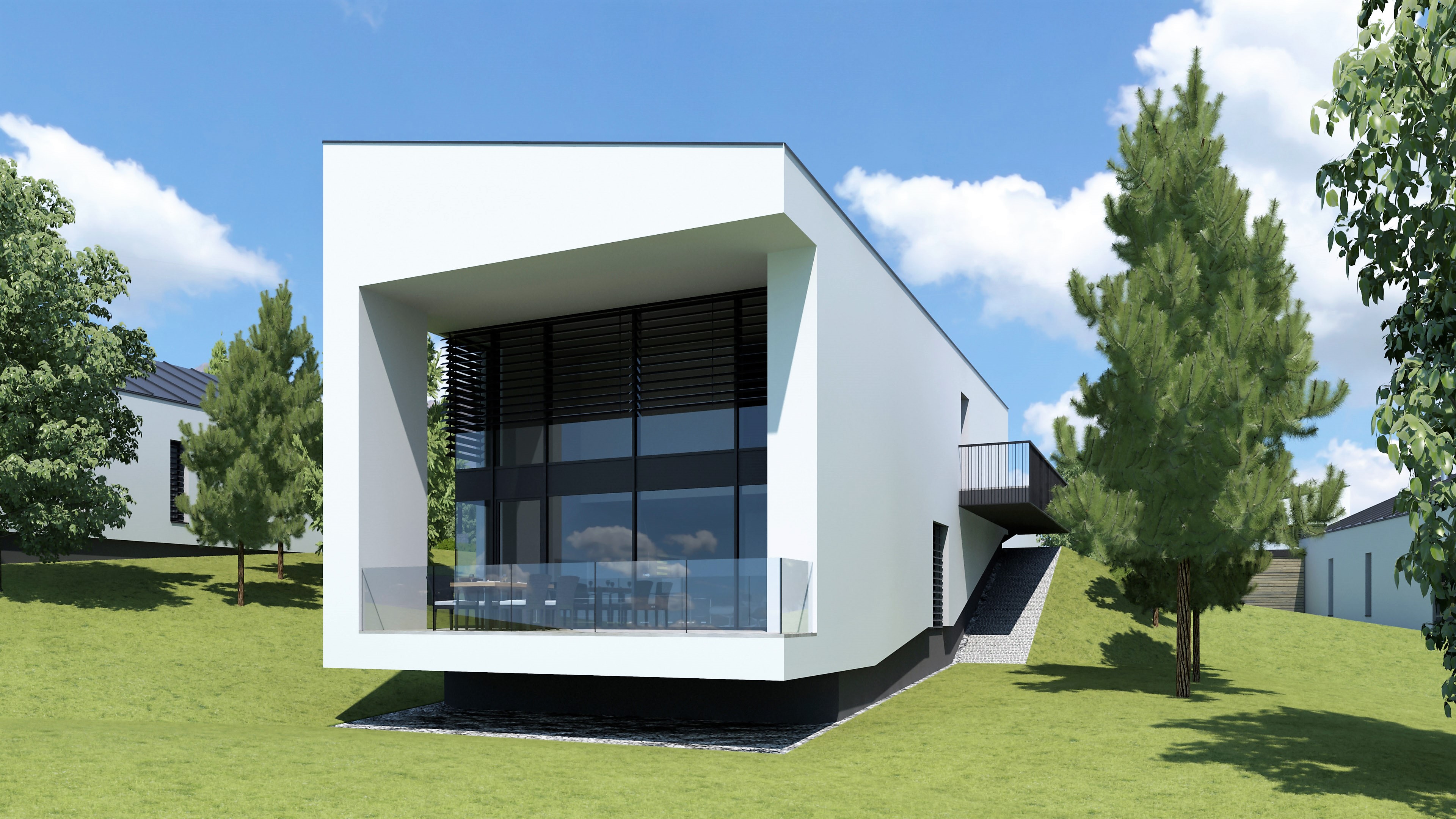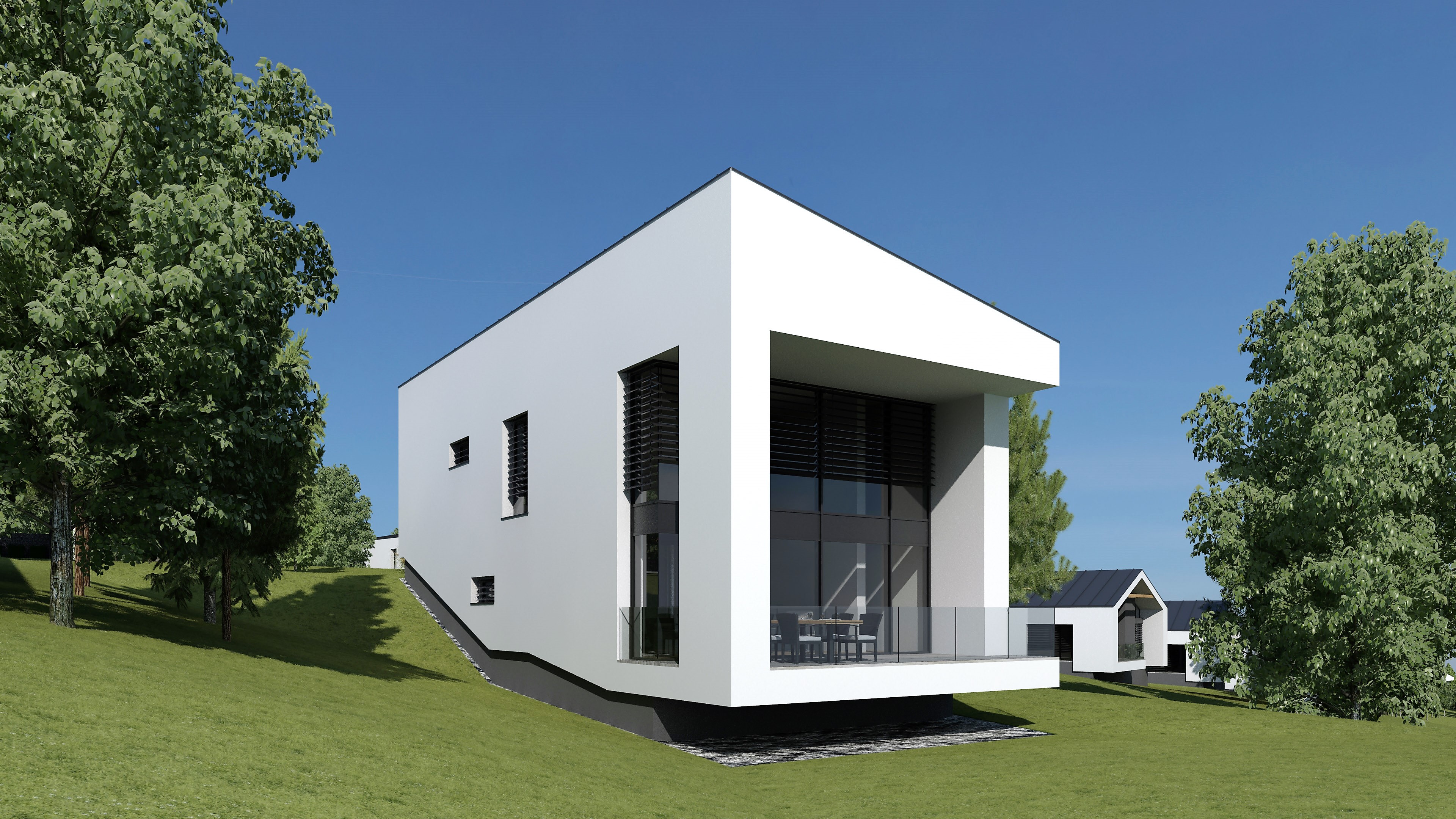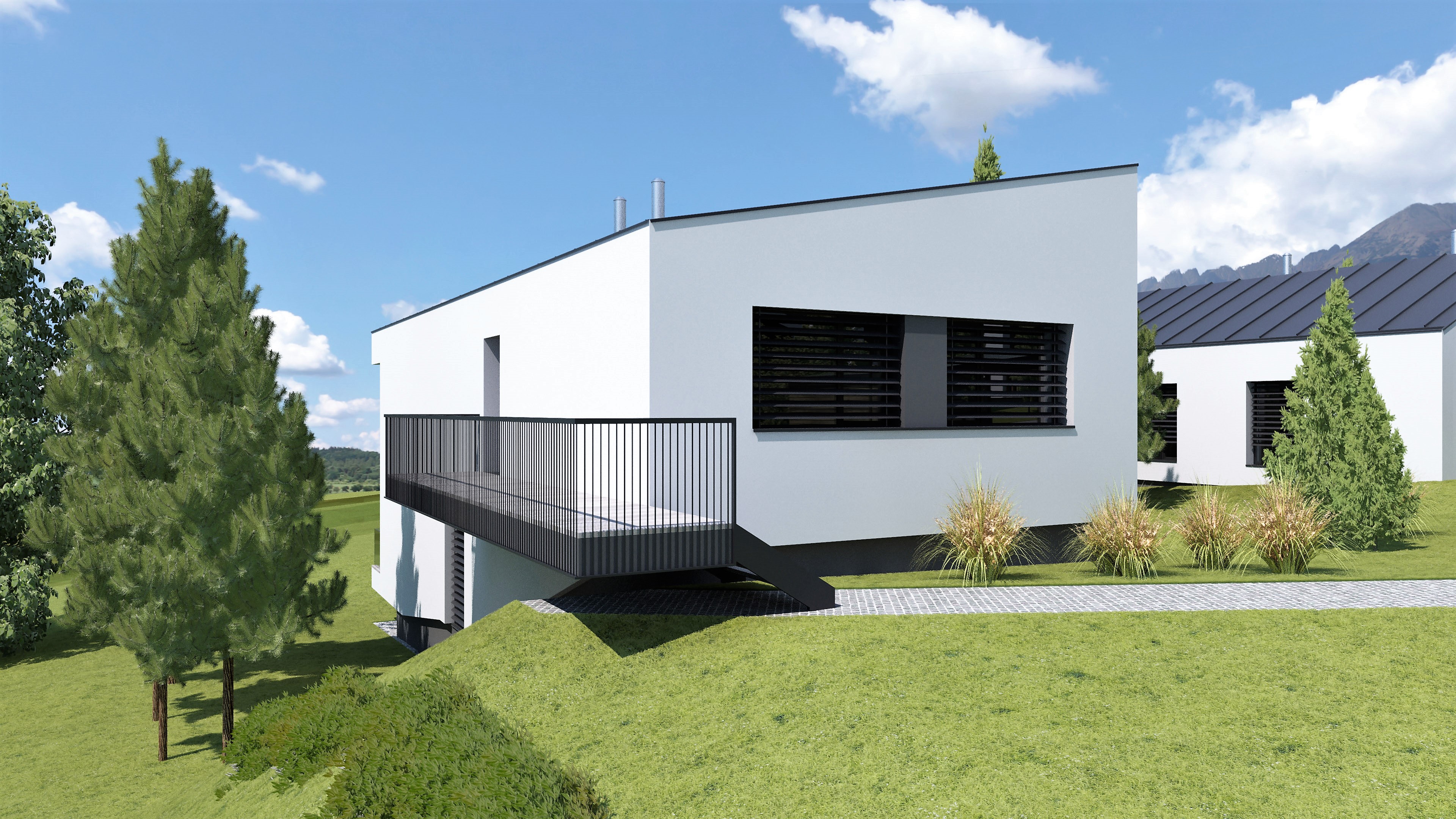 Samostatne stojaci 4 izbový dvojpodlažný dom. Umožňuje komfortné bývanie pre 4 až 6 osôb. Dom je vhodný pre osadenie do svahovitého pozemku. Zo strany ulice pôsobí dom introvertne, o to viac sa otvára smerom do záhrady. Horné poschodie domu tvorí vstupná hala, WC, kúpeľňa, spálňa rodičov, dve izby a galéria. Na prvom podlaží sa nachádza kuchyňa s jedálňou, WC, technická miestnosť a obývačka, z ktorej je vstup na terasu. Presklená fasáda prepúšťa dostatok denného svetla a vytvára prirodzené prepojenie interiéru s exteriérom. Prekrytá terasa je ideálnym miestom pre relax a oddych.