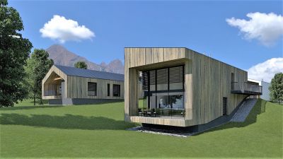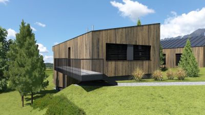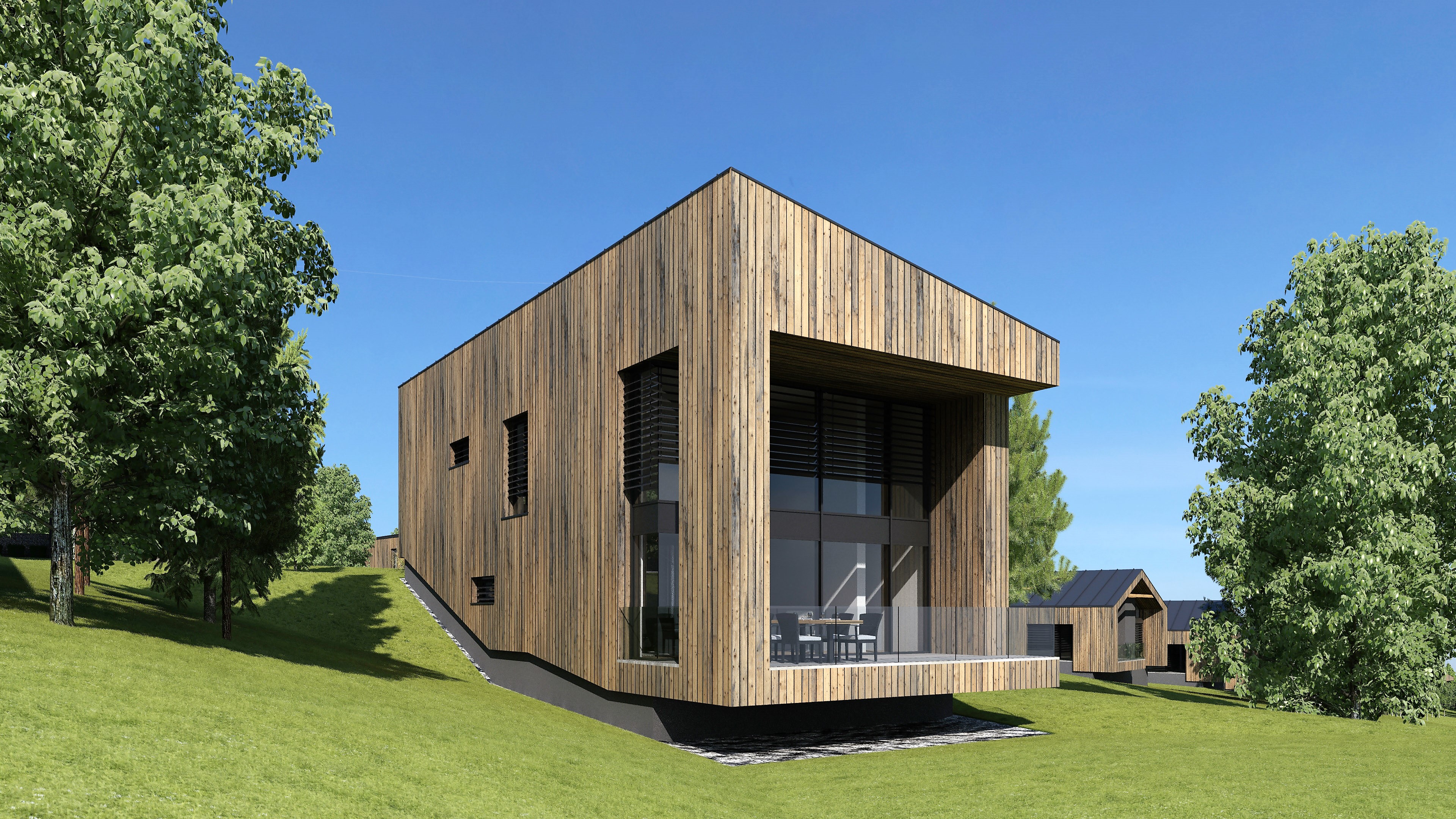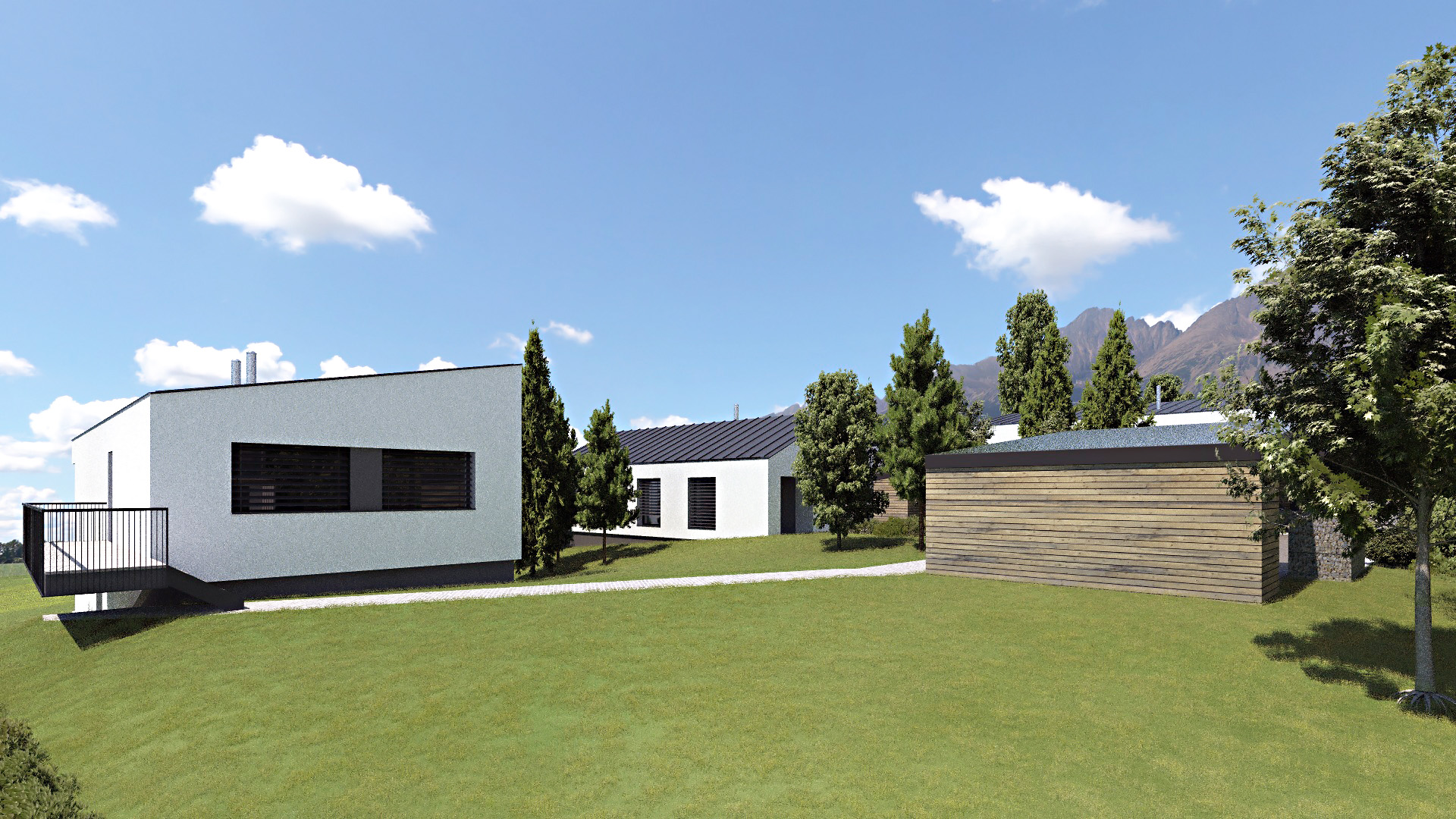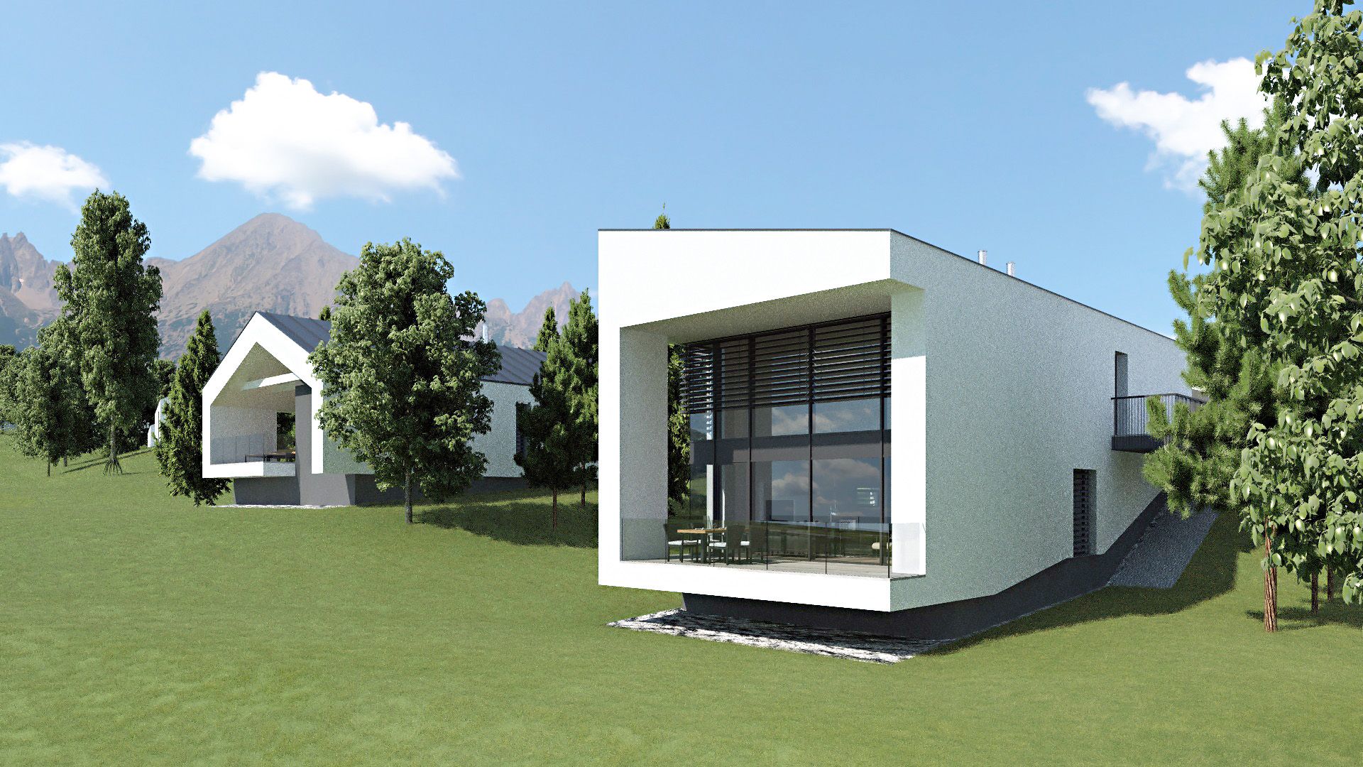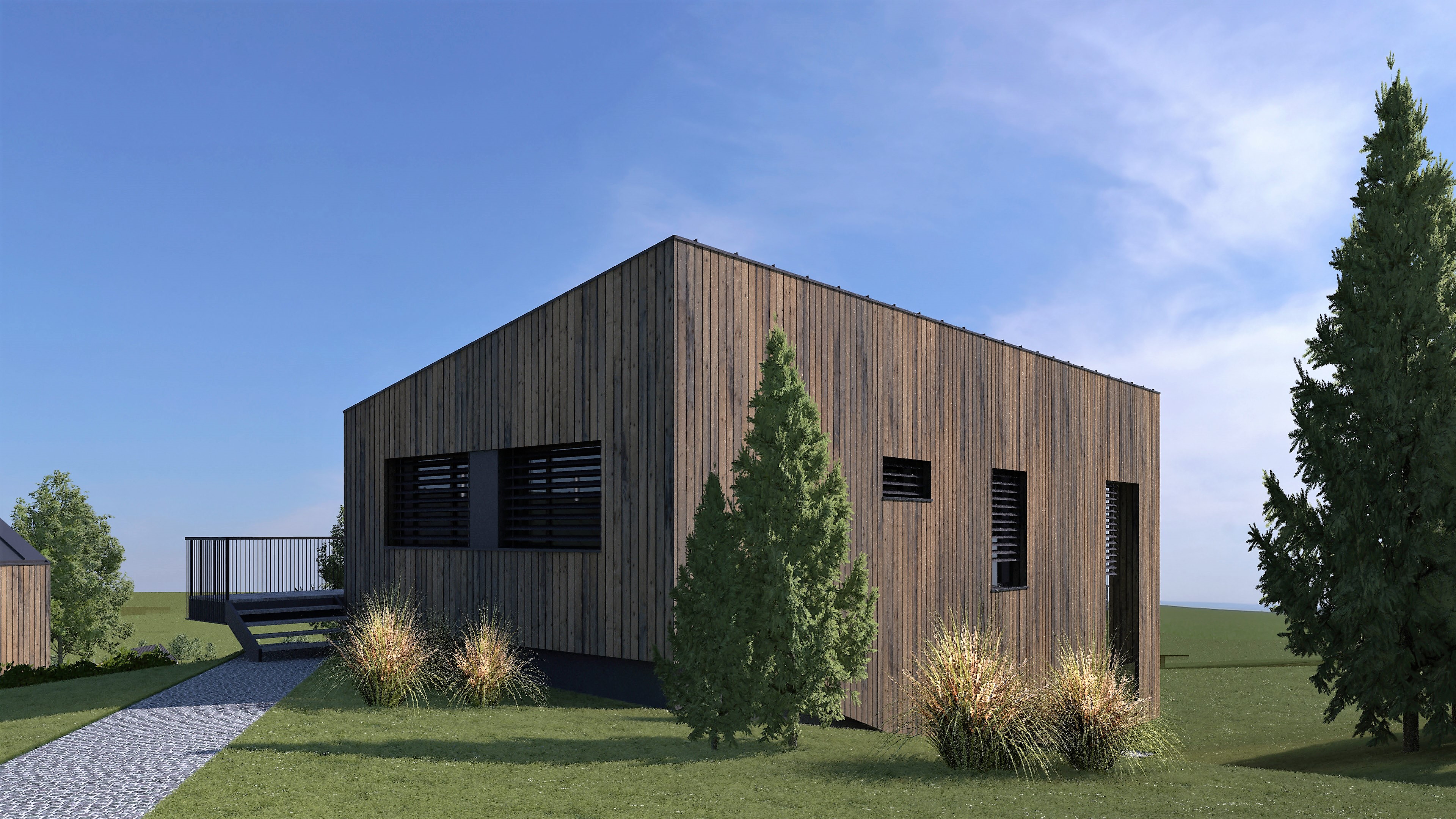 Samostatne stojaci 4 izbový dvojpodlažný dom. Umožňuje komfortné bývanie pre 4 až 6 osôb. Dom je vhodný pre osadenie do svahovitého pozemku. Zo strany ulice pôsobí dom introvertne, o to viac sa otvára smerom do záhrady. Horné poschodie domu tvorí vstupná hala, WC, kúpeľňa, spálňa rodičov, dve izby a galéria. Na prvom podlaží sa nachádza kuchyňa s jedálňou, WC, technická miestnosť a obývačka, z ktorej je vstup na terasu. Presklená fasáda prepúšťa dostatok denného svetla a vytvára prirodzené prepojenie interiéru s exteriérom. Prekrytá terasa je ideálnym miestom pre relax a oddych.